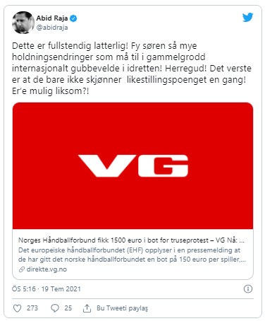 Norveç Kültür Bakanı Abid Raja, "Çok saçma! Spor dünyasının modası geçmiş uluslararası ataerkil düzeninde daha ne kadar değişim gerekiyor" diye tweetledi.
