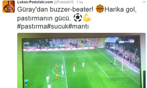 Ezeli rakiplerinin aldığı yenilgiden duyduğu memnuniyeti dile getiren Podolski, ezeli rakiplerini kızdıracak ifadeler kullandı. Podolski, "Güray'dan buzzer-beater. Ne harika bir gol, pastırmanın gücü" yazıp, mesajının içine basketbol topu ve futbol topu ikonları koydu.