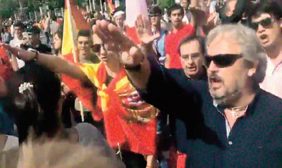 İspanya ’nın başkenti Madrid, dün de Katalan bağımsızlık referandumu karşıtı eylemlere sahne oldu. Plaza Mayor’da toplananlar, “Yaşasın sivil muhafızlar”, “Yaşasın ulusal polis”, “Birleşik İspanya’yı hiçbir kuvvet yenemez” sloganları attı. Faşist lider Franco’ya atfedillen marşı söyleyerek Nazi selamı veren radikal taraftarlar olduğu da görüldü.
