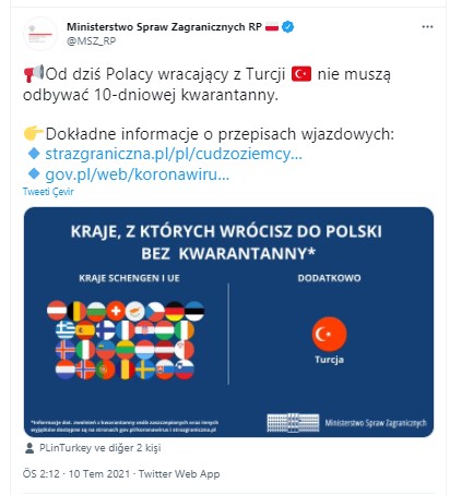 Bu arada Polonya basınında yer alan haberlerde, AB ve EEA ülkelerine ek olarak Türkiye’nin de karantina uygulanmayan ülkeler listesine alındığı ve Türkiye’den gelenlerin negatif sonuçlu Kovid-19 testi ibraz etmeleri durumunda 10 günlük karantinadan muaf tutulacağı kaydedildi.