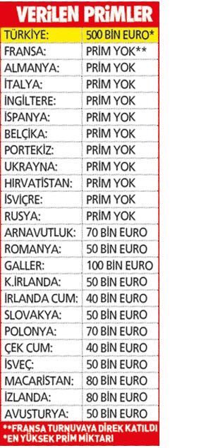 EURO 2016'da gruptan çıkamayan A Milli Takım'ın turnuvaya katılım primi 500 bin Euro'ydu.