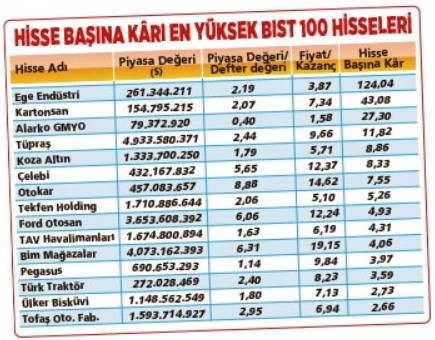 FED ve ECB açıklamaları sonrasında belirsiz hava dağılmış görünüyor. Gelişmekte olan ülkelere yeni para akışı mümkün. Bu gelişme borsanın cazibesini artıracak. Aşırı değer kayıplarının yaşandığı dönemler aynı zamanda aşırı değerlenmeler için hazırlık anlamına gelir. Bu dönemde doğru hisseleri seçmek önemli. Hisse başına karı en yüksek BIST 100 hisseleri uzun vadeli yatırım için tercih olabilir. Hisse başına karı en yüksek BIST 100 hisselerinin başında Ege Endüstri, Kartonsan, Alarko GMYO, Tüpraş, Koza Altın ve Çelebi var. Bu 15 hisse içerisinde piyasa değeri en yüksek şirket 4.9 milyar dolar ile Tüpraş olurken onu, 4 milyar dolar ile BİM, 3.6 milyar dolar ile Ford Otosan izliyor.