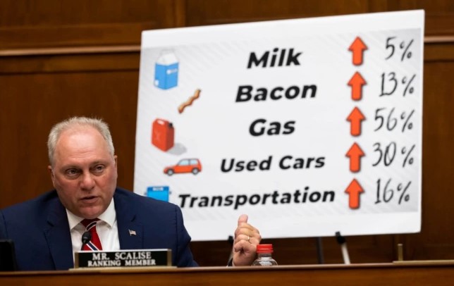 Kongre’deki oturumda Cumhuriyetçi Kongre üyesi Steve Scalise, ABD’de süt, pastırma, benzin, ikinci el araba ve ulaşım gibi tüketim kalemlerinde enflasyon artışını bir tablo ile göstererek yüzde 5 oranında bir enflasyonun kabul edilemez olup olmadığını sordu.