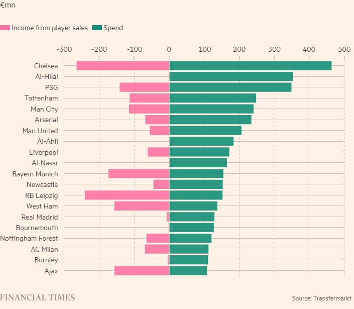 ABD’li sahibi olan Chelsea FC iki yıl üst üste futbolda en fazla brüt harcama yapan kulüp olsa da, Suudi takımı Al-Hilal yakın bir farkla ikinci sırada yer aldı ve rahatlıkla en fazla net harcama yapan kulüp oldu. Transfermarkt’a göre Riyad ekibi, Paris Saint-Germain’den Brezilyalı forvet Neymar’a 90 milyon Euro ve Wolverhampton Wanderers’tan Ruben Neves’e 55 milyon Euro olmak üzere yeni oyuncular için 345 milyon Euro harcadı.