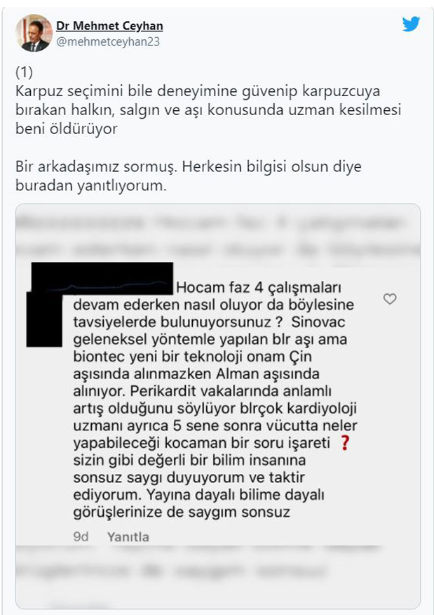Prof. Dr. Ceyhan, sözlerine şöyle devam etti: "Çin / Alman aşısı farkına gelince, üretim Almanya’da değil, ABD’de yapılıyor. Çin’in üretim denetiminde problem var. Bakın, Çin aşısı olanları tekrar aşılamak zorunda kaldık. 5 yıl sonra aşı ne yapacak? Pandemi ve aşının gerçekleri bunlar. 5 yıl bekleyelim mi? Salgın ne olacak? Bu yaklaşımla, hiçbir aşı veya ilaç geliştirilemez. Kullandığınız ağrı kesici, antibiyotik, kanser ilaçlarında 5 yılı bırakın, 5 hafta beklenildi mi sanıyorsunuz? Uzun süreli yan etkileri öngörme yöntemleri var, bu aşılarda da kullanıldı ve güvenli bulundu. Son olarak; nolur, dünyada en uzun eğitimi gerektiren bu konularda Google'dan bakıp, iki cahilin yazısını okuyarak fikir sahibi olmaya çalışmayın. Karpuza gösterdiğiniz saygı."