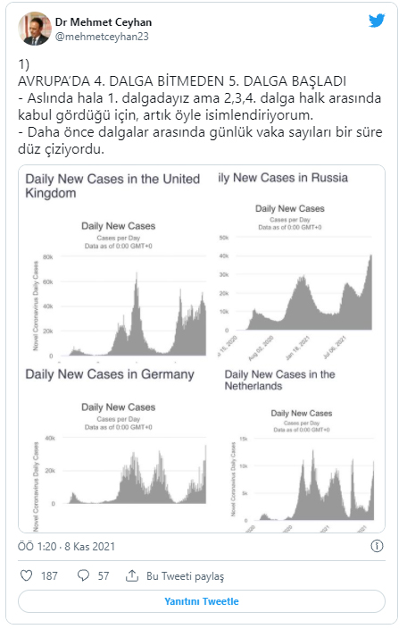 "Türkiye'de 1.-2. dalga arası günlük 1.000, 2.-3. dalga arası 5.000, 3.-4. dalga arası 10.000 vaka gözlendi. Bu kez Avrupa'da çok sayıda ülkede 4. dalga bitmeden, 5. dalga başladı. Bunun nedenleri, önlemlerin ve kısıtlamaların yetersizliği, iş yerlerinde, toplu taşımada ve toplanmalarda(düğünler, kapalı alanlarda toplantılar, spor karşılaşmaları, kongreler, okullar) artan kalabalıklar, etkenin özelliği: delta varyantının bulaşma özelliği, aşı ile % 80 toplumsal korunma hedefinden giderek uzaklaşmamız, aşılama % 80 orana ulaşmadıkça, aşılanma arttığında doğru orantılı olarak vaka sayısının da azalacağı yanılgısı. Dikkatli olmalıyız, önlemleri artırmazsak aynı durumu biz de yaşarız. Vaka artan ülkelerde günlük ölü sayıları da artıyor."