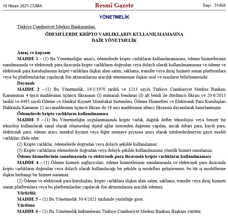 Bu noktada, doğrudan kripto varlıkları konu edinen ilk mevzuat düzenlemesi olan 16 Nisan 2021 tarihli ve 31456 sayılı Resmi Gazete’de yayımlanan ve TCMB tarafından düzenlenen “Ödemelerde Kripto Varlıkların Kullanılmamasına Dair Yönetmelik”ten de kısaca söz etmek uygun olur kanaatindeyim. Öncelikle, bu düzenlemenin yönetmelik olması itibarıyla, ikincil mevzuat boyutunda kaldığını ve kripto varlıkları genel olarak ve kapsamlı şekilde düzenlemediğini belirtmek gerekir. Söz konusu yönetmelik ile TCMB kendi görev ve yetki alanı ile sınırlı bir düzenlemeye gitmiş ve kripto varlıkların ödeme aracı olarak kullanılmasını yasaklamış ve kripto paralarla yapılan işlemlerin ödeme ve elektronik para kuruluşları aracılığıyla yapılmasını önleme yoluna gitmiştir. Ancak bu düzenleme ile kripto varlıkların Türk Hukuku’nda, yasa dışı hale geldiğini veya yasaklandığını söylemek hukuken doğru olmayacaktır. Aksine, burada kripto varlıkların ödeme aracı olarak kullanılması dışında, hukuk düzeni tarafından kabul edildiği söylenebilir.