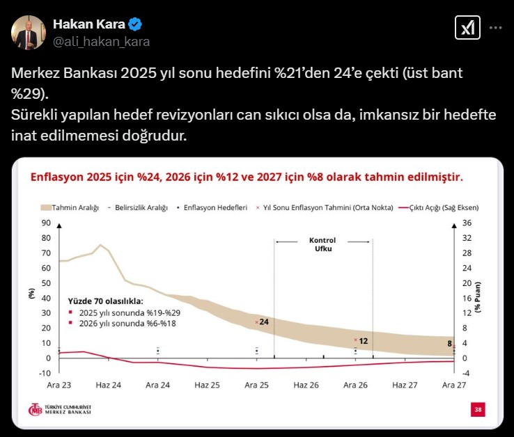 Bilkent Üniversitesi Ekonomi Bölümü Öğretim Üyesi Prof. Dr. Hakan Kara, X (Twitter) hesabından paylaştığı mesajda, 2025 yıl sonu hedefinin yüzde 21’den yüzde 24’e çekilmesi üzerine şu değerlendirmede bulundu: