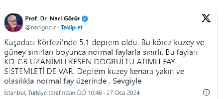 "Kuşadası Körfezi’nde 5,1 deprem oldu. Bu körez kuzey ve güney sınırları boyunca normal faylarla sınırlı. Bu fayları KD-GB UZANIMLI KESEN DOĞRULTU ATIMLI FAY SİSTEMLETİ DE VAR. Deprem kuzey kenara yakın ve olasılıkla normal fay üzerinde."