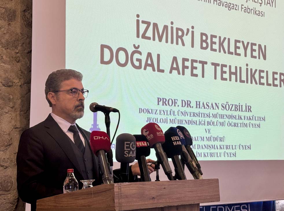 Dokuz Eylül Üniversitesi (DEÜ) Deprem Araştırma ve Uygulama Merkezi Müdürü Prof. Dr. Hasan Sözbilir, İzmir Büyükşehir Belediyesi tarafından Tarihi Havagazı Fabrikası'nda düzenlenen İzmir Afet Koordinasyon Çalıştayı'nda deprem, tsunami ve volkanik patlamalara ilişkin sunum gerçekleştirdi.