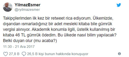 Bahçeşehir Üniversitesi Siyaset Bilimi ve Uluslararası İlişkiler Bölümü’nde görev yapan Profesör Yılmaz Esmer’in yurtdışından ısmarladığı bir kitabına ödediği gümrük vergisi üzerine geçen yılın aralık ayında “Ülkemizde, dışarıdan ısmarladığınız bir adet mesleki kitaba bile gümrük vergisi alınıyor. Bir kitaba 46 TL gümrük ödedim. Bu ülkede nasıl bilim yapılacak? Belki duyan olur (mu acaba?)” ifadeleriyle paylaştığı tweet, yurtdışından kargo yoluyla gelen kitaplara vergi muafiyeti sağladı.