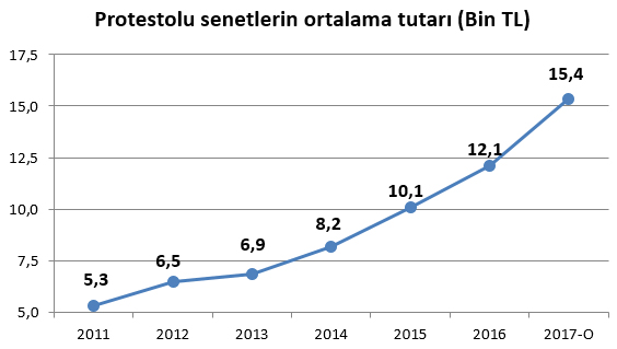 Yani ocak ayları itibariyle protesto edilen senetlerin ortalama tutarı 2015'ten bu yana sırasıyla yuvarlatarak aktarırsak 9 bin, 11 bin ve 15 bin lira olarak gerçekleşti.