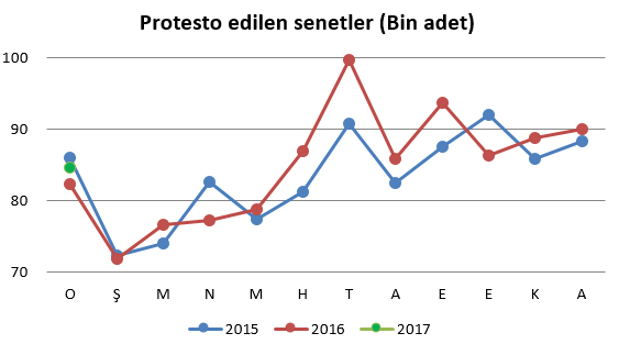 Örneğin ocak ayları itibariyle son üç yılda birbirine çok yakın sayıda senet protesto edildi. Protestolu senet sayısı 2015'in ocak ayında yaklaşık 86 bin, geçen yıl ocakta 82 bin, bu yıl ise 85 bin oldu. Neredeyse aynı düzeyde protesto söz konusu.