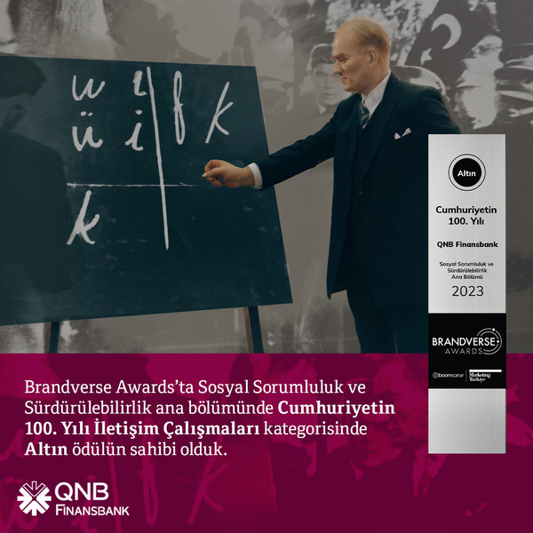 Reklam, pazarlama ve pazarlama iletişimi alanlarında üretilen en başarılı işlerin yarıştığı Brandverse Awards’da QNB Finansbank, Sosyal Sorumluluk ve Sürdürülebilirlik ana bölümünde Cumhuriyetin 100. Yılı İletişim Çalışmaları kategorisinde reklam filmi ile Altın ödüle layık görüldü. Proje, deprem bölgesindeki 100 okulun renovasyonunu üstlenerek 30 binden fazla çocuğa eğitim ışığı olmasını amaçlıyor. Bu anlamlı projenin başarısı, QNB Finansbank’ın eğitime verdiği önemi ve toplumsal sorumluluk bilincini bir kez daha gözler önüne serdi.