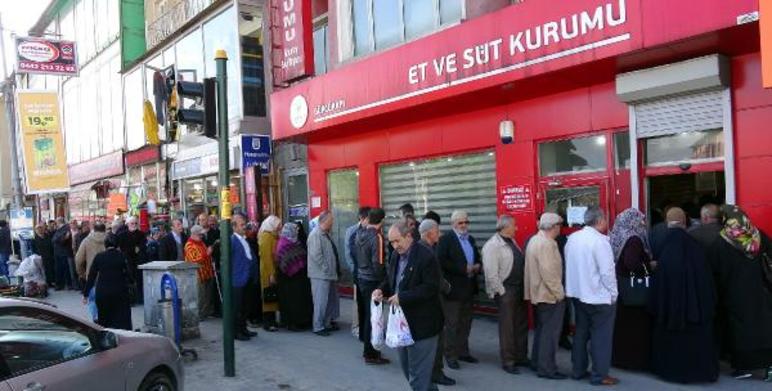 Erzurum Merkez Yakutiye ilçesindeki Et ve Süt Kurumu'nun tek satış mağazası önünde sabahın erken saatlerinden itibaren kuyruğa girenler, ucuz et alabilmek için saatlerce bekliyor. Kıymanın kilosunun 28 lira 75 kuruş, kuşbaşının 31, bifteğin 36, pirzolanın 50, bonfilenin 65 liradan satıldığı kombina satış mağazasında sıraya girenlerin bu işi ranta dönüştürmemesi için bir kişiye en fazla 3 kilo kıyma ve 3 kilo kuşbaşı satılıyor.