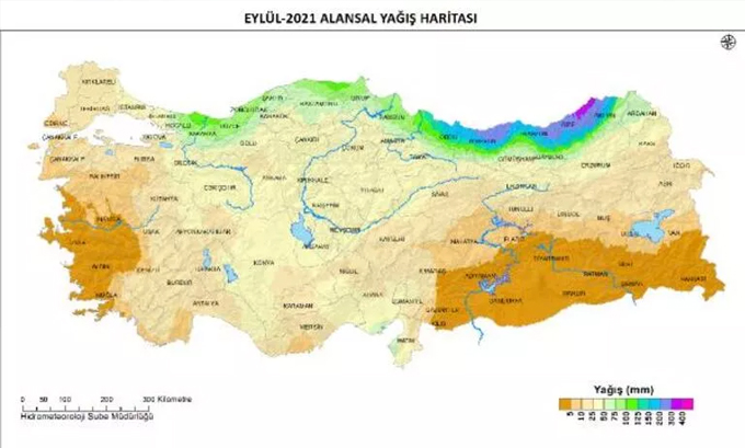 Meteoroloji Genel Müdürlüğü'nün '2021 Yılı Eylül Ayı Alansal Yağış Raporu' yayımlandı. Türkiye geneli eylül ayı yağışları, geçen yıl yağışlarının üzerinde gerçekleşti. Eylül ayı yağışı 29,4 mm, normali (1981- 2010) 21,8 mm ve 2020 yılı eylül ayı yağışı 9,4 mm olarak açıklandı. Yağışlarda normale göre yüzde 35, geçen yıl eylül ayı yağışlarına göre yüzde 313'e yakın artış yaşandı.