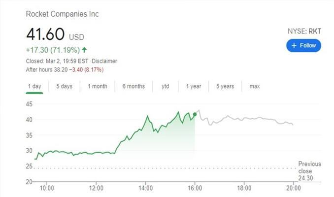 Reddit’in borsa konuşulan bölümü olan WallStreetBets’teki kullanıcılar tarafından ani bir talep yaşayan Rocket Companies şirketinin hisseleri bir gün içerisinde yüzde 71 arttı.