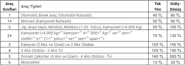 Karayolları Genel Müdürlüğü’nden İstanbul-Bursa-İzmir Otoyolu’nun Gebze-Orhangazi kesimi ve Osmangazi Köprüsü ile ilgili yaptığı açıklama geçiş ücretlerinde yeni bir düzenleme yapıldığını, otoyol ve otoyol geçiş ücretlerinin ortalama yüzde 20 oranında artırılırken, Osmangazi Köprüsü geçiş ücretinin yüzde 26 oranında indirildiğini açıkladı. Buna göre Osmangazi Köprüsü geçiş ücreti otomobiller için 65.65 TL olarak belirlendi.