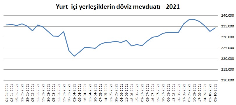 Türkiye Cumhuriyet Merkez Bankası(TCMB) tarafından açıklanan verilere göre, bir önceki hafta 232 milyar 684 milyon dolar olan yurt içi yerleşiklerin döviz mevduatı 8 Ekim ile sona eren haftada 234 milyar 276,2 milyon dolara geldi.