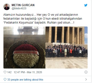 Babacan ve kurucular kurulu bu toplantıdan önce Anıtkabir’e giderek Mustafa Kemal Atatürk’ün mozolesine çelenk koydu. Kuruculardan Metin Gürcan’ın sosyal medya hesabından paylaştığı fotoğrafa göre çelenkte “Demokrasi ve Atılım Partisi” adı yazıyor.