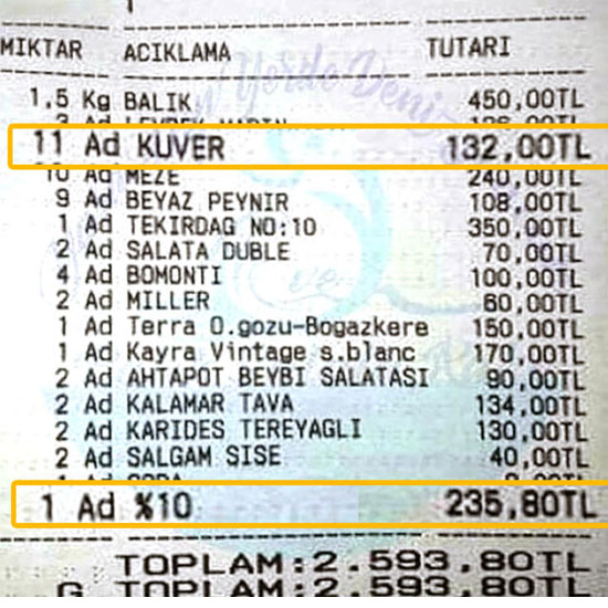 İzmir Alaçatı ve Muğla Bodrum’daki restoranların müzik bedellerini faturaya yansıtmasının ardından şimdi de hem kuver hem de yüzde 10 hizmet bedeli almaya başladı. Yeni uygulamaya bazı vatandaşlar sosyal medyadan tepki gösterirken, Turizm Restaurant Yatırımcıları ve İşletmecileri Derneği (TURYİD) Başkan Yardımcısı Barış Tansever, kuverin ekmek ve su için olduğunu, hizmet bedelinin ise garsonlara yönelik olduğunu söyledi. Tüm Restoranlar, Lokantalar ve Tedarikçiler Derneği (TÜRES) Başkanı Ramazan Bingöl ise hem kuver hem de hizmet bedeli almanın etik açıdan doğru olmadığını kaydetti.