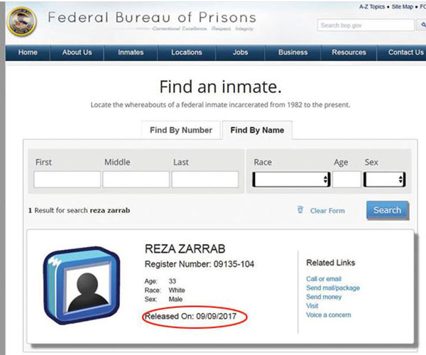 ABD’de yaklaşık 1.5 yıldır tutuklu yargılanan İran asıllı Türk işadamı Reza Zarrab’la ilgili tahliye bilmecesi yaşandı. ABD Adalet Bakanlığı’na bağlı Federal Cezaevleri Bürosu’nun internet sitesindeki resmi kayıtlarda, ‘09135-104’ kayıt numaralı Zarrab’ın önceki gün (09.09.2017) cezaevinden tahliye edildiği görülüyor. Ancak Hürriyet’in ulaştığı Amerikalı yargı kaynakları, Zarrab’ın tahliye edildiği iddiasını doğrulamadı. Dün (Pazar) resmi tatil olduğu için cezaevi yetkililerine ise ulaşılamadı.