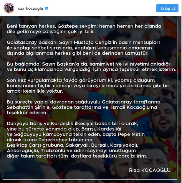 Bu süreçte yapıcı davranan sağduyulu Galatasaray taraftarına, Sebahattin Şirin'e, Göztepe taraftarına ve İsmail Kocaoğlu'na teşekkür ederim. Dünya'ya barış ve kardeşlik ilkesiyle bakan biri olarak, yine bu süreçte yanımda olup barışı, kardeşliği ve sağduyuyu kamuyouna telkin eden, başta Pepe Metin olmak üzere Fenerbahçe tribününe, Beşiktaş Çarşı grubuna, Sakaryalı, Bursalı, Karşıyakalı, Ankaragüçlü, Trabzonlu ve adını saymayı unuttuğum diğer takım taraftarı olan tüm dostlara teşekkürü borç bilirim."