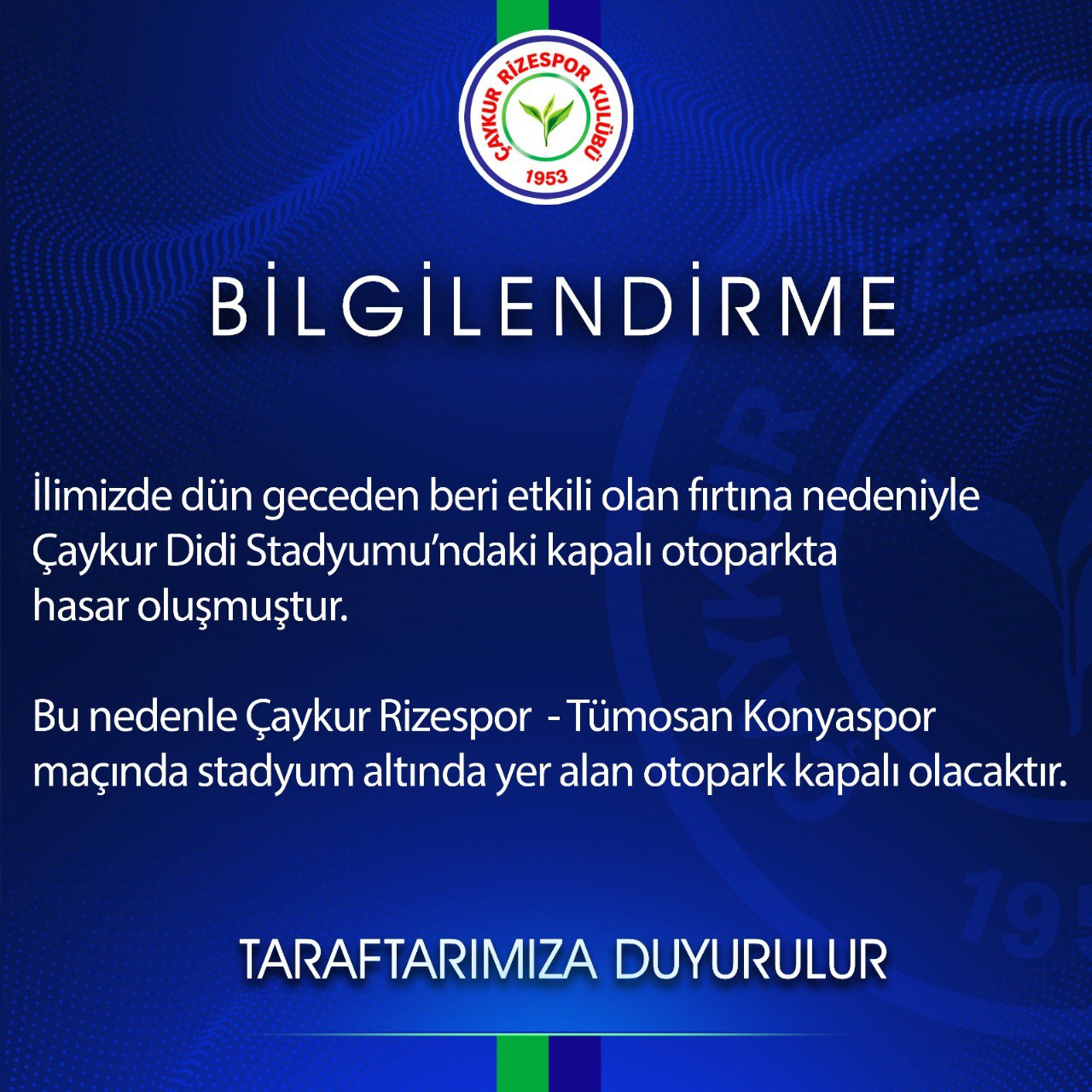 Konuyla ilgi kulüpten yapılan yazılı açıklamada; "İlimizde dün geceden beri etkili olan fırtına nedeniyle Çaykur Didi Stadyumu'ndaki kapalı otoparkta hasar oluşmuştur. Bu nedenle Çaykur Rizespor-Tümosan Konyaspor maçında stadyum altında yer alan otopark kapalı olacaktır" ifadelerine yer verildi.