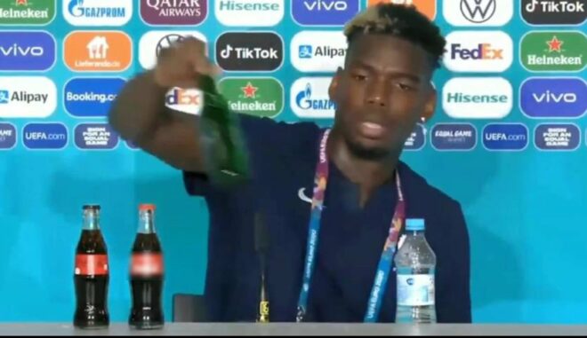 Portekizli yıldız Cristiano Ronaldo’nun Macaristan maçı öncesi düzenlenen basın toplantısında EURO 2020’nin sponsorlarından biri olan kola markasını kenara itmesi büyük gündem yaratmıştı. ‘Su için’ mesajı veren Ronaldo’nun ardından şimdi de Fransa Milli Takımı’nın yıldızı Paul Pogba benzer bir tepki gösterdi.