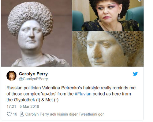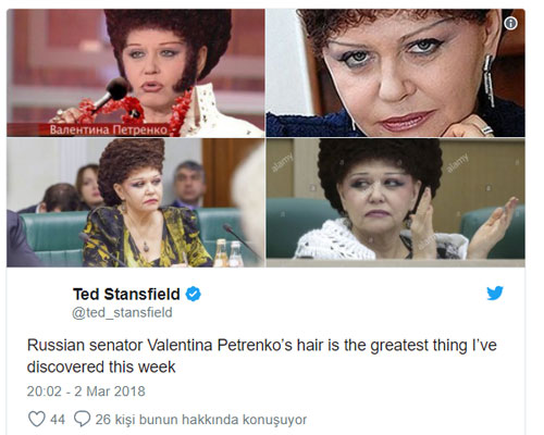 Rusya'ya bağlı Hakasya Cumhuriyeti'nden Rus senatör Valentina Petrenko, farklı saç modeliyle yurtdışındaki Twitter kullanıcılarının ilgi odağı oldu.