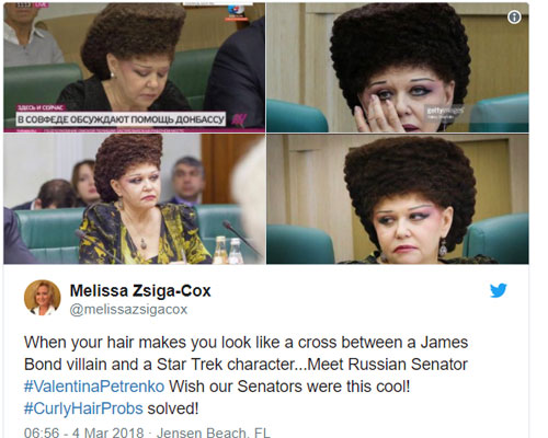 Melissa Zsiga-Cox "Saçınız James Bond'daki kötü adam ve Star Trek karakteri arasında bir şey gibi görünmenizi sağladığında… Rus senatör Petrenko ile tanışın, keşke bizim senatörlerimiz de böyle havalı olsaydı" ifadelerini kullandı.