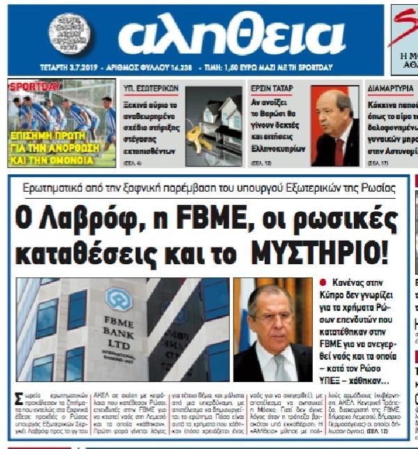 Rum medyasının, 'Gizem' olarak manşete çektiği habere göre Lavrov, Kiprianu ile Moskova’da gerçekleşen görüşmesinde Rus yatırımcıların Limasol’da kilise inşası için kayyum atanan FBME bankasına yatırdığı paraları gündeme getirdi. Paraların kaybolduğunu ifade eden Lavrov'un tutumuna dikkat çeken Rum medyası, “ilk kez ve bir süper güç tarafından böyle bir konudan söz edildiğine” vurgu yaptı.