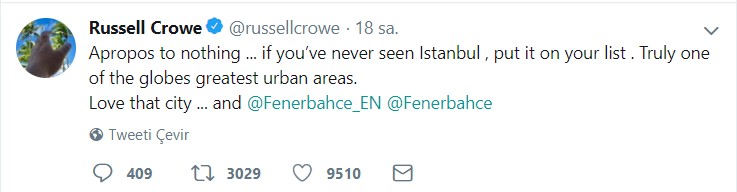 Dünyaca ünlü Yeni Zelandalı aktör Russell Crowe, Twitter hesabından Fenerbahçe ile ilgili paylaşımda bulundu.