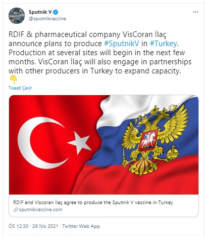 RDIF tarafından yapılan açıklamada VisCoran'ın Sputnik V aşısının Türkiye'de üretimine birkaç tesiste gelecek aylarda başlamasının öngörüldüğünü belirtti.