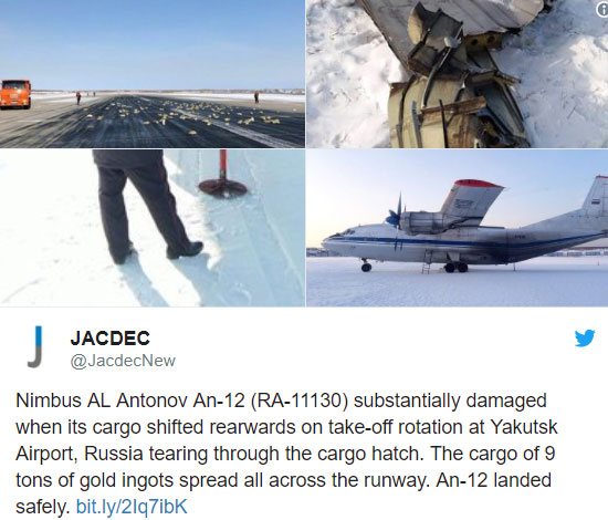 Rusya’ya bağlı Yakutistan’ın başkenti Yakutsk’tan Krasnoyarsk’a havalanan 9.3 ton altın ve gümüş alaşımı külçe yüklü An-12 uçağının kargo kapağı kırıldı. Uçağın içindeki 20 kiloluk külçeler piste döküldü.
