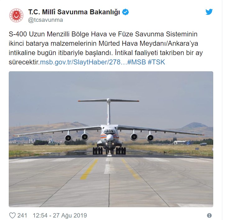 Milli Savunma Bakanlığı, resmi açıklamayla sevkıyatı duyurdu: "Türkiye’nin hava ve füze savunma ihtiyacının karşılanmasına yönelik S-400 Uzun Menzilli Bölge Hava ve Füze Savunma Sisteminin tedarik sözleşmesi 11 Nisan 2017’de imzalanmış, sözleşme kapsamında S-400 Uzun Menzilli Bölge Hava ve Füze Savunma Sisteminin birinci batarya malzemelerinin intikali 12-25 Temmuz 2019 tarihleri arasında tamamlanmıştı.
