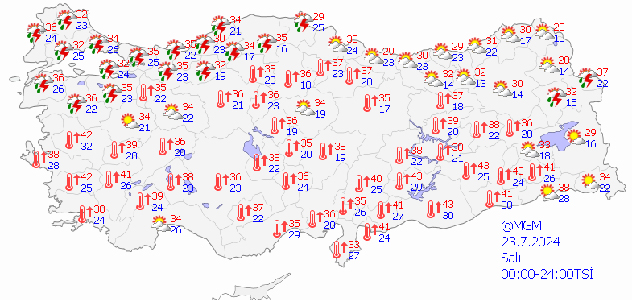 Bugün ülkemizin kuzey ve doğu kesimlerinin parçalı yer yer çok bulutlu, Bolu, Karabük, Giresun, Trabzon, Artvin, Kars ve Ardahan çevreleri, Düzce'nin, Zonguldak'ın, Bartın'ın ve Rize'nin iç kesimleri, Eskişehir'in kuzeyi, Bursa'nın ve Ağrı'nın doğusu, Bitlis'in kuzeydoğusu ve Van'ın kuzeyinin yerel olmak üzere sağanak ve gök gürültülü sağanak yağışlı, diğer yerlerin az bulutlu ve açık geçeceği tahmin ediliyor.