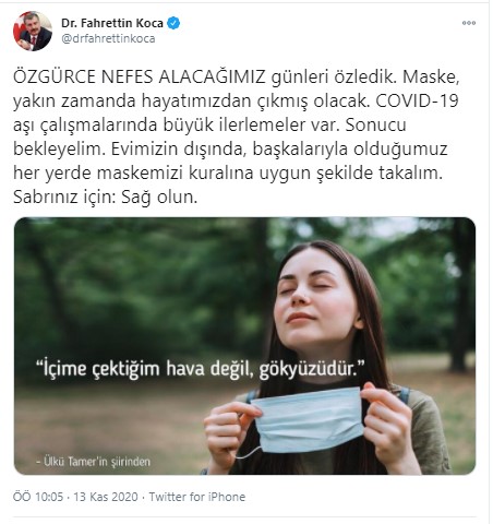 Koca, "Özgürce nefes alacağımız günleri özledik. Maske, yakın zamanda hayatımızdan çıkmış olacak. Kovid-19 aşı çalışmalarında büyük ilerlemeler var. Sonucu bekleyelim. Evimizin dışında, başkalarıyla olduğumuz her yerde maskemizi kuralına uygun şekilde takalım. Sabrınız için sağ olun." açıklamasında bulundu.