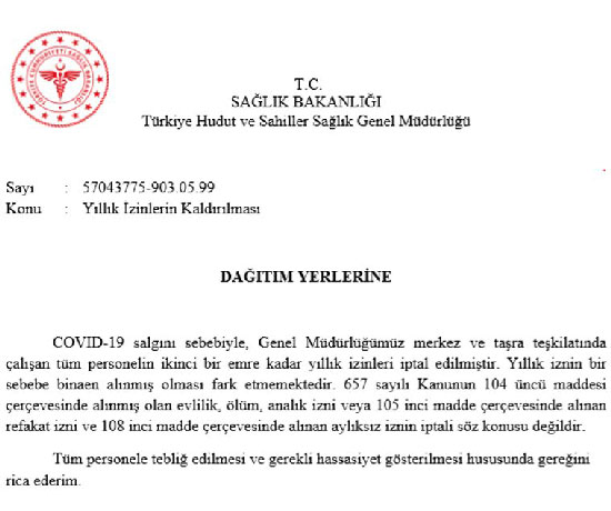 Sağlık Bakanlığı Hudut ve Sahiller Sağlık Genel Müdürlüğü, korona virüs salgını sebebiyle tüm izinleri kaldırdı