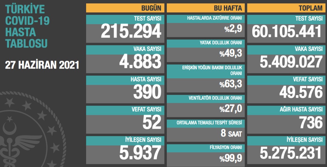 27 Haziran'da açıklanan son 24 saatlik verilere göre; 390'ı semptomatik olmak üzere toplam 4 bin 883 yeni vaka tespit edildi. Vefat sayısı ise 52 olarak kayıtlara geçti. Böylece Türkiye'de korona virüs nedeniyle hayatını kaybedenlerin sayısı 49 bin 576’ya, toplam vaka sayısı ise 5 milyon 409 bin 027'ye yükseldi.