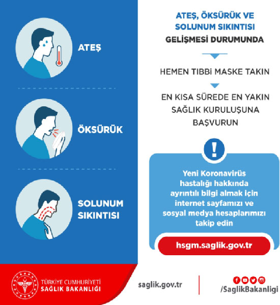 Yeni korona virüs hastalığı hakkında ayrıntılı bilgi için Halk Sağlığı Genel Müdürlüğünün internet sitesi "hsgm.saglik.gov.tr" ve bakanlığın sosyal medya hesaplarının takip edilmesi istenildi.