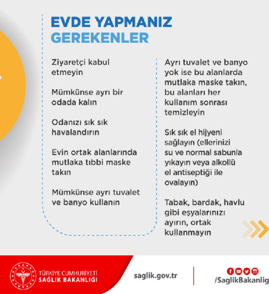"Ziyaretçi kabul etmeyin. Mümkünse ayrı bir odada kalın. Odanızı sık sık havalandırın. Evin ortak alanlarında mutlaka tıbbi maske takın. Mümkünse ayrı tuvalet ve banyo kullanın. Ayrı tuvalet ve banyo yok ise bu alanlarda mutlaka maske takın, bu alanları her kullanım sonrası temizleyin. Sık sık el hijyeni sağlayın. Ellerinizi su ve normal sabunla yıkayın veya alkollü el antiseptiği ile ovalayın. Tabak, bardak, havlu gibi eşyalarınızı ayırın, ortak kullanmayın."