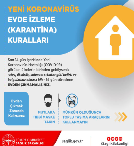 Sağlık Bakanlığı'nın sosyal medya hesaplarından yayımlanan "Yeni korona virüs evde izleme (karantina) kuralları" başlıklı paylaşımda, "Son 14 gün içerisinde yeni koronavirüs hastalığı görülen ülkelerden birinden geldiyseniz, ateş, öksürük, solunum sıkıntısı gibi belirti ve bulgularınız olmasa bile 14 gün süresince evden çıkmamalısınız" uyarısı yapıldı.