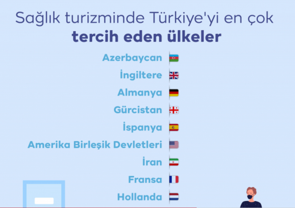 Türkiye, sağlık turizmi alanında en çok ziyaretçiyi Azerbaycan, İngiltere, Almanya, Gürcistan ve İspanya’dan alıyor. Bu ülkeleri Amerika Birleşik Devletleri, İran, Fransa ve Hollanda izlerken diğer en önemli kaynak pazarlarımız arasında Batı Asya ülkeleri ve Afrika ülkeleri yer alıyor. Türkiye’nin sağlık turizmi alanındaki yükselişi son yıllarda hız kazandı. TÜİK verilerine göre; “Sağlık ve Tıbbi Nedenlerle” gelen ziyaretçi sayısı 2015 yılında 360 bin seviyesindeyken bu sayı pandemi öncesi dönem olan 2019 yılında 662 bin 87 kişiye ulaştı.