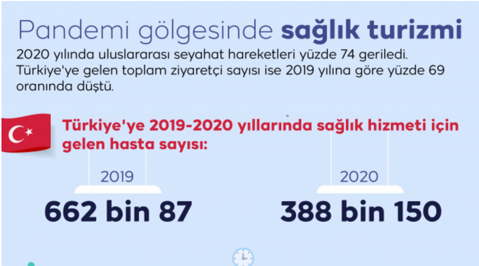 "Türkiye İstatistik Kurumu verilerine göre; ülkemize “Sağlık ve Tıbbi Nedenlerle” gelen ziyaretçi sayısı 2019 yılında 662 bin 87 kişiye ulaşmıştı. Pandemi nedeniyle birçok ülkenin sınırlarını kapatması ve vatandaşlarının yurt dışı seyahatlerini kısıtlaması nedeniyle 2020 yılında sağlık turizmi kapsamında gelen ziyaretçi sayısında yüzde 41 oranında düşüş yaşandı. TÜİK verilerine göre 2020 yılında ülkemize sağlık turizmi kapsamında gelen ziyaretçi sayısı 388.150 kişi oldu."