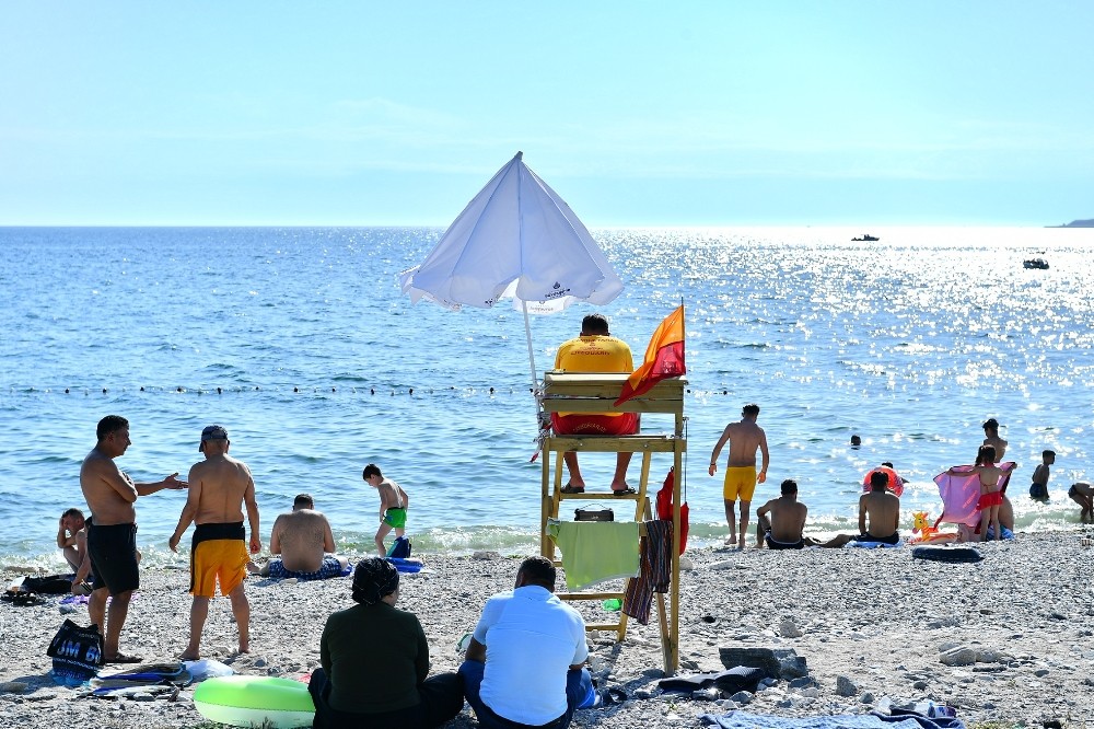 Sahilde görevli cankurtaranlar, denize giren vatandaşlara, belirlenen alanın dışına geçmemesi için zaman zaman uyarılarda bulundu.