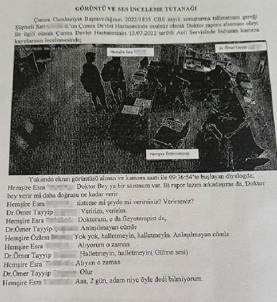 Soruşturma kapsamında hastanedeki görüntü ve sesli güvenlik kamera kayıtları incelendi. Görüntülerde hemşire Esra T.’nin bir arkadaşına raporun lazım olduğunu söylediği, doktor Ömer Tayyip Ç.’nin ise “Veririm olur” dediği tespit edildi. Görüntüler aracılığıyla Sait U.’nun o gün hastanede olmadığı saptandı. Bilgi Teknolojileri ve İletişim Kurumu'ndan alınan raporda da Sait U.'nun olay günü Esra T.'yi 3 kez telefonla aradığı ve baz istasyonu sinyallerine göre de Mersin'de olduğu belirlendi.