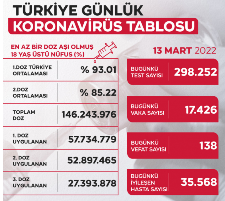 Son 24 saatte 17 bin 426 yeni vaka tespit edildi, 138 kişi vefat etti. 35 bin 568 kişi KOVID-19'u yenerek sağlığına kavuştu.
