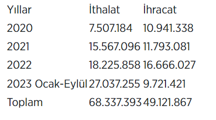 Böylece 2020-2023 eylül döneminde toplam 68 milyon 337 bin 393 dolarlık ithalata karşılık, 49 milyon 121 bin 867 bin dolarlık ihracat gerçekleştirildi. Toplam dış ticaret hacmi ise 117 milyon 459 bin 260 dolar oldu.