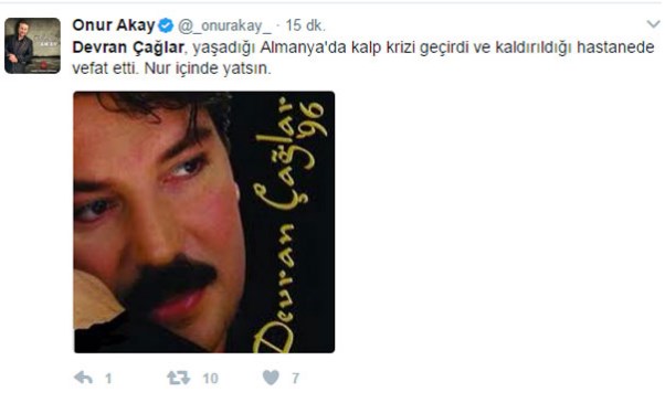 Türk sanat müziğinin ünlü sanatçısı Onur Akay, 80'li yıllarda fantezi türünde şarkıları ile popüler olup tanınan ve İstanbul Tarabya sahnelerine damgasını vuran Devran Çağlar'ın, uzun süredir yaşadığı Almanya’da kalp krizi geçirdiğini ve kaldırıldığı hastanede hayatını kaybettiğini duyurdu.